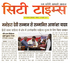 निराला स्मृति संस्थान, रायबरेली द्वारा युवा साहित्यकार और ब्लॉगर आकांक्षा यादव को मातृभाषा हिंदी काव्य साहित्य के क्षेत्र में उल्लेखनीय साहित्य सृजन के लिए निराला जयंती के पावन अवसर पर 21 फरवरी, 2015 को 'मनोहरा देवी सम्मान' से अलंकृत किया गया। यह सम्मान निराला जी की पत्नी की स्मृति में दिया जाता है। उनकी अनुपस्थिति में यह सम्मान उनके पतिदेव एवं वरिष्ठ साहित्यकार श्री कृष्ण कुमार यादव, निदेशक डाक सेवाएं, इलाहाबाद परिक्षेत्र ने ग्रहण किया । इस अवसर पर पुष्पहार, शाल, प्रशस्ति-पत्र और पाँच हजार की नकद राशि देकर उन्हें सम्मानित किया गया।